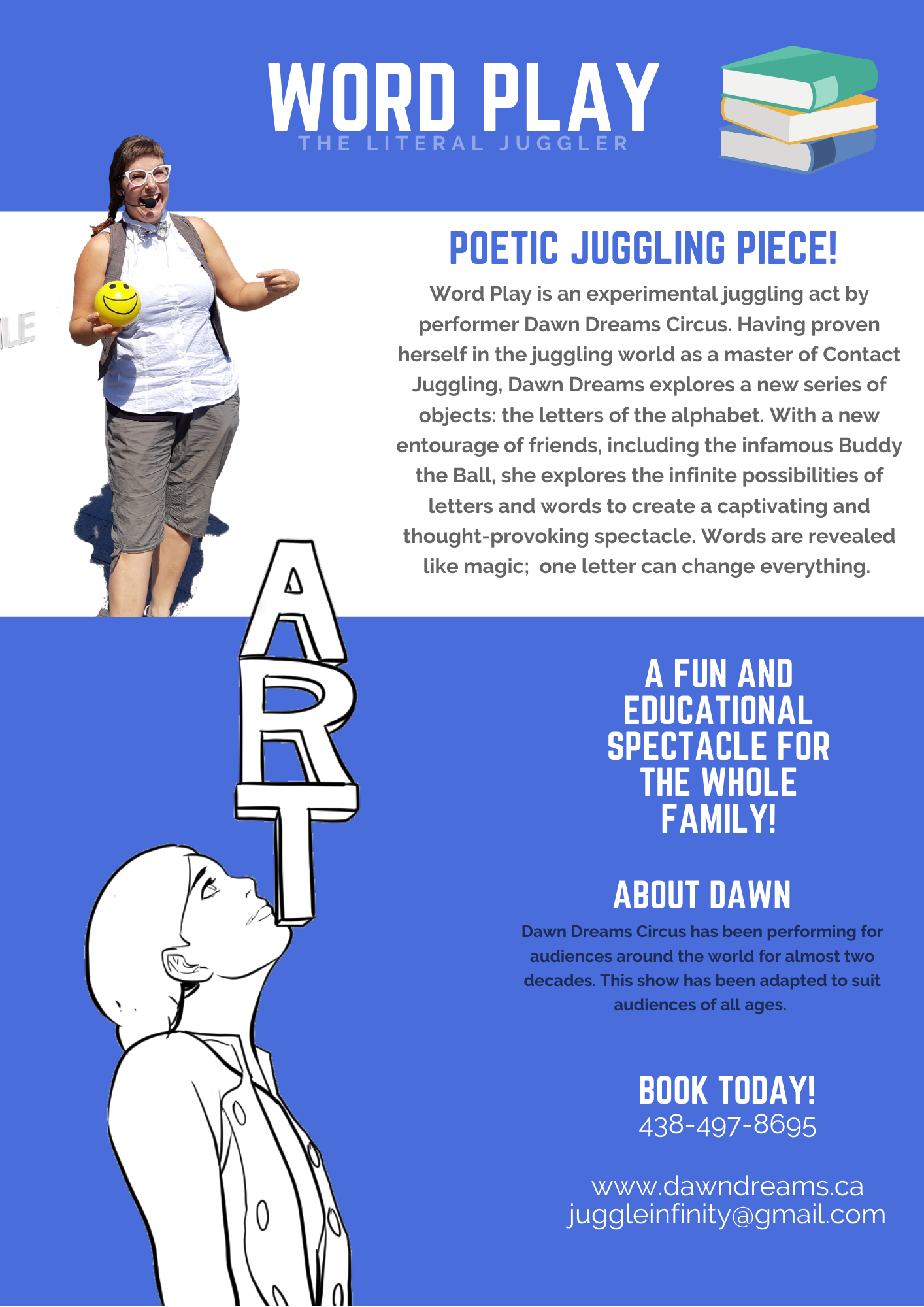 Dawn is now a mother and she incorporated the juggling, writing and clowning into her caregiving. She continues to study the psychology of play, and grounds this knowledge in scientific literature. Dawn is a busking advocate and has been working alongside Busk.co since 2011 to help art be free to all people. She is now in creation mode, bringing all of her skills together in one big show!